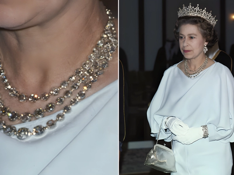 The Queen has a large collection of diamond necklaces, but this one is still one of her favorites, as demonstrated by the numerous times she has worn it. We can understand why the exquisite, three-strand diamond necklace is a favorite option for her majesty because it is eye-catching and distinctive.