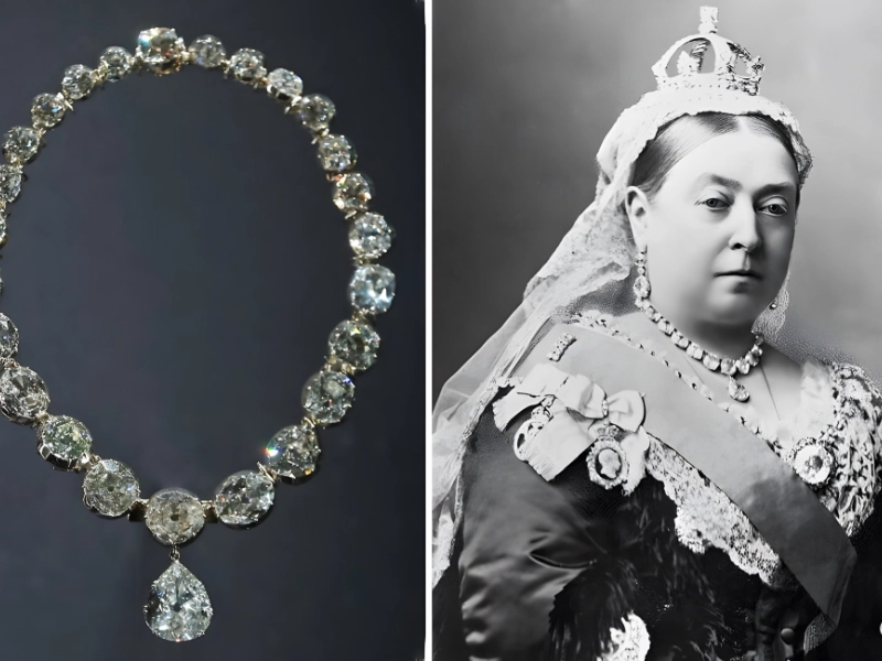 Among the most magnificent pieces in the Royal Collection, this stunning necklace has twenty-six huge diamonds. The centerpiece stone is the 22.48-carat Lahore Diamond, an Indian diamond weighing up to 11.75 carats.
