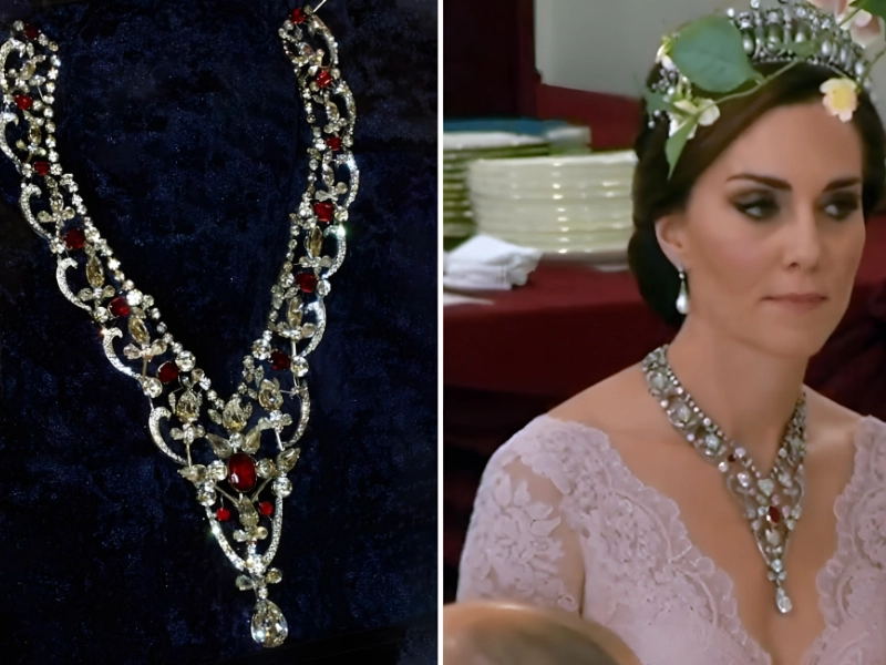 In 2017, Kate Middleton wore it with Queen Mary’s Lovers Knot tiara at a Spanish State luncheon. The Duchess’s delicate, pink lace neckline complemented the necklace, which appeared to be custom-made for her.