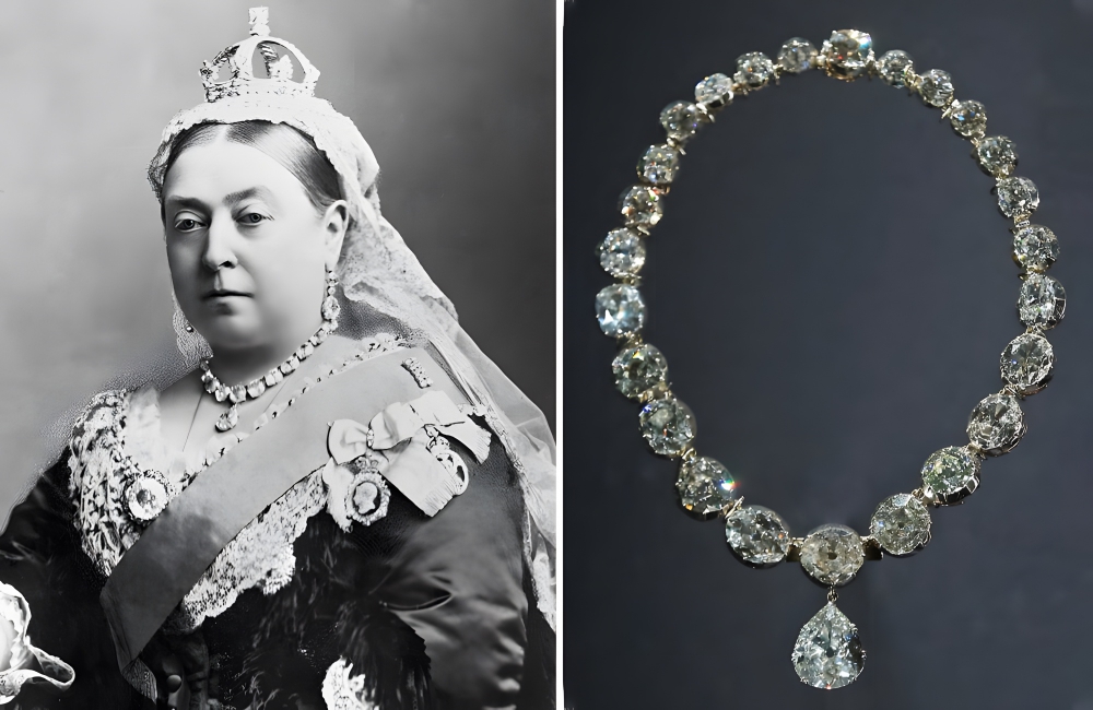The original creation worn by Queen Victoria was a much more elaborate version than the one we see today. It had a fringe that continued all along the neckline of the wearers dress in an elaborate design, literally dripping with diamonds.