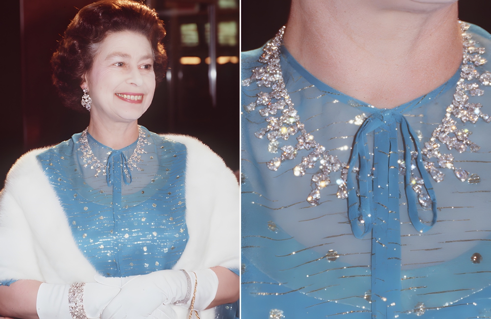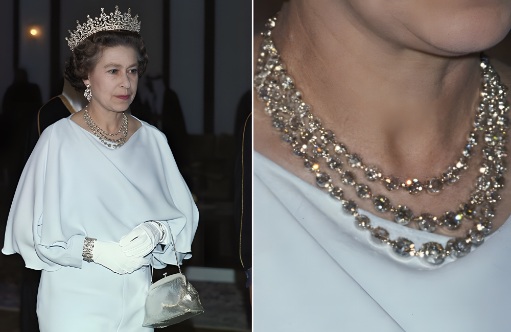The Queen’s image is used on the Bahamian dollar bill wearing this precise necklace. It was also worn by Kate Middleton who looked absolutely stunning in 2014 at a Gala at the National Portrait Gallery in London.