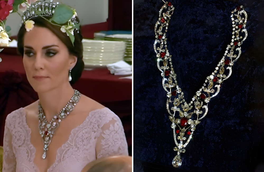 It was seen on Kate Middleton at a Spanish State banquet in 2017, paired with Queen Mary’s Lovers Knot tiara. The necklace looked like it was made for the Duchess and was complimented perfectly by her soft, pink lace neckline.