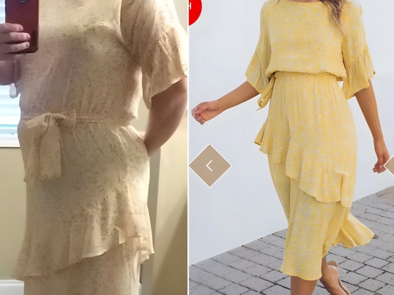Given that the dress that was advertised is not the one that arrived in the mail, it’s probably for the best. The cut and color of this yellow chiffon dress are different from the one in the picture. Rather than seeming like an enjoyable, humorous outfit, this Sparsheen imitation appears dowdy and stolid.