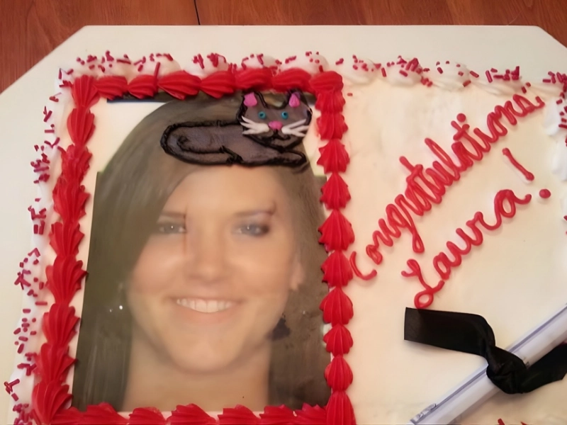 The plan was for the bakery to print an image of Laura and add a cap to her head. Rather, the bakery drew a cat on her head after mishearing. Given that they correctly identified the rolled-up diploma scroll in the lower right corner, the mistake is unexpected. Still, the bakery gets credit for the adorable cat illustration.