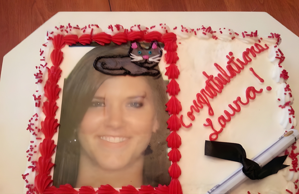 The bakery was supposed to print a picture of Laura and draw a cap on her head. Instead, the bakery misheard and drew a cat on her head. The misunderstanding is surprising, considering that they got the rolled-up diploma scroll in the bottom right-hand corner correct. The bakery does deserve credit for the cute cat illustration, though.