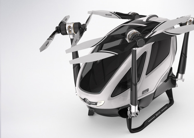 Ehang 184 is completely autonomous aircraft. Its weight is 200 kg, it is equipped with 8 motors and has 8 propellers, which are placed on the four emerging “hands”.