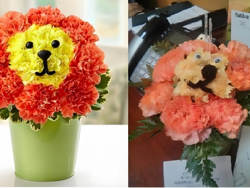 Animal bouquets from 1-800-Flowers typically retail for around $59.99, and the company offers bouquets in different shapes and sizes. When a Facebook user ordered the “Blooming Lion” Flower Arrangement, she was expecting a charming lion face but instead received a very messy bunch of flowers. She was forced to criticize the business on her review page.