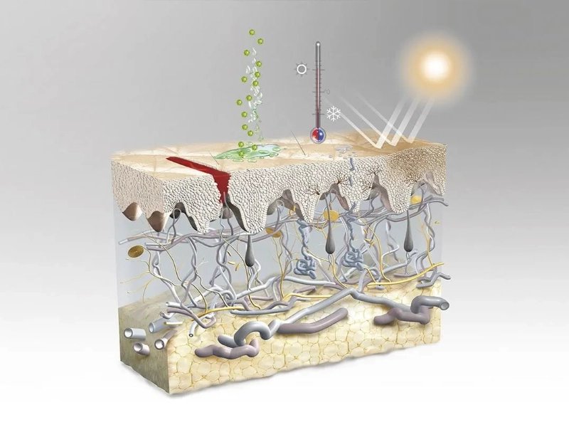 Mostly composed of keratinocytes, which create keratin, a protein offering strength and protection, the epidermis is the outermost layer. Environmental elements like hazardous chemicals, viruses, and bacteria are blocked by this layer. Melanocytes, which synthesis melanin, the pigment in charge of skin colour, also abound in the epidermis. Melanin absorbs and diffues sunlight energy to shield the skin from damaging UV rays. Crucially, the epidermis is always regenerating itself; old skin cells shed and are replaced by fresh ones, hence preserving the protective barrier.