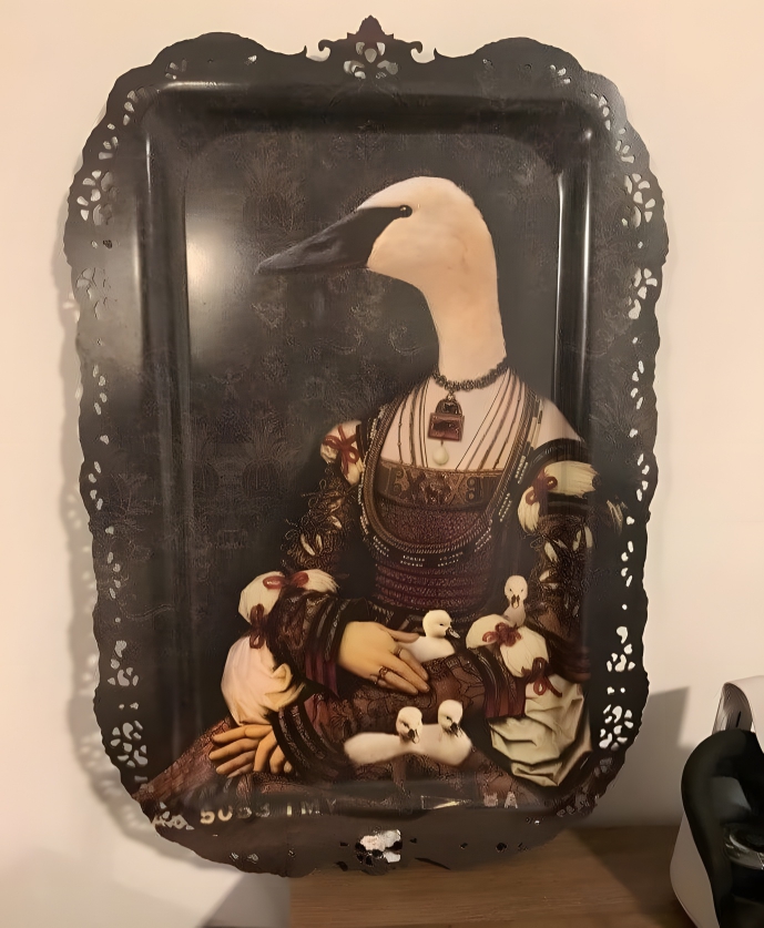 The extravagance of having a Victorian woman, who just happens to be a duck, meticulously painted on a tray is already enough to give your dinner guests a hearty laugh. But what takes this to the next level is her adorable, fluffy ducklings, who might as well be dressed in tiny bonnets and drilling dresses- like their quaking matriarch. This tray wasn’t meant to serve appetizers; it’s meant to be a conversation starter at dinner parties.