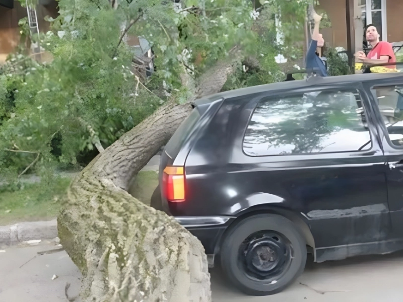 This fortunate car owner completely avoided having to pay tens of thousands of dollars in repairs. A tree landed on top of his automobile, but it was twisted so that it completely missed it.