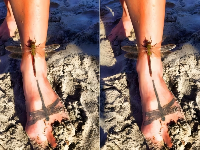 The dragonflies knew they had a safe location to land when they noticed the person had a dragonfly tattoo on their foot. This insect might have been wondering if the dragonfly was a true friend he could get to know.