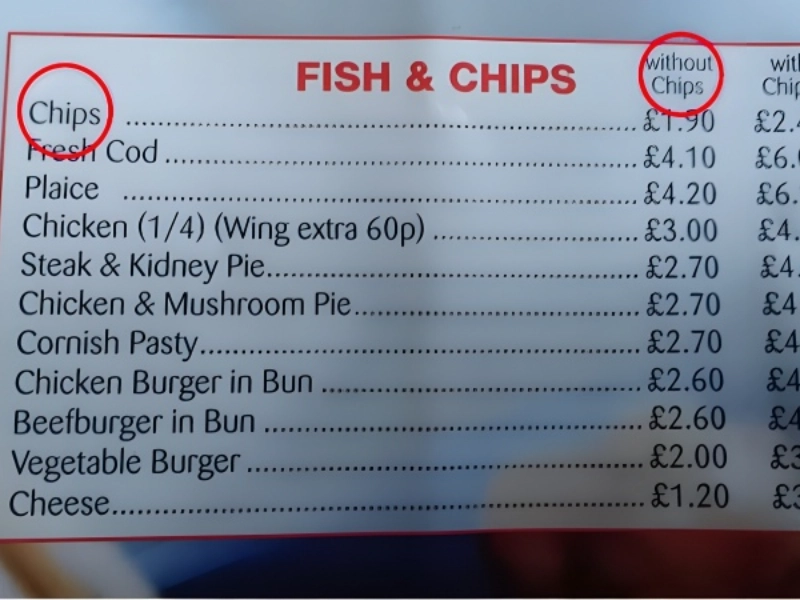A great meal enjoyed all throughout the world are fish and chips. But have you ever thought about simply ordering some chips and eliminating the fish? Alternatively you may have chips…without chips. Alternatively with chips on the side. The chips area of this graph-like menu with several price alternatives went a bit fishy whatever was supposed to be shown on it. This uncertainty can cause consumers to wonder about the fundamental essence of their dinner. Perhaps they ought to have left the chips out of this completely. The arrangement of the menu seems to have been ill-considered, overwhelming diners. Everyone’s attention instantly centres on the dubious chip issue on the menu, which may cause them to ignore the unusual choice of cheese (just cheese) either with or without a side of chips. For all the wrong reasons, this strange presentation can cause both laughter and aggravation, hence it is a memorable dining experience. It reminds us that creating menus meant to appeal to consumers rather than confuse them mostly depends on simplicity and clarity.