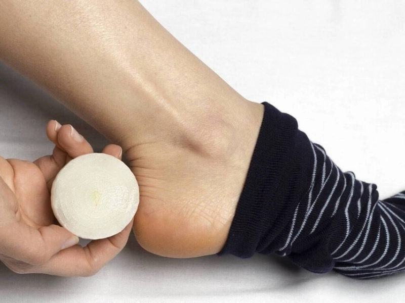 The important next step is laying the onion slices on your feet. With an eye towards the arch and ball of the foot where the skin is thinnest and most absorbent, arrange the slices on the soles of your feet. Make sure the slices come into direct touch with your flesh. Though this is optional, some people like to keep the onion slices in place using a little bit of plastic wrap.