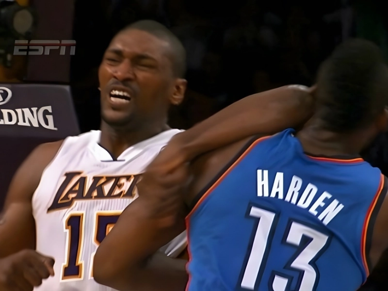 Metta World Peace, originally known as Ron Artest, elbowed Oklahoma City Thunder star James Harden in the face during the 2012 playoffs, earning him a $35,000 fine and a seven-game suspension. A brawl broke out between the two teams as a result of the event, and several players were sent off the field.