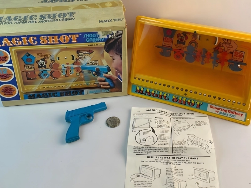 Enter the Ideal Magic Shot Shooting Gallery now to have a never-ending pleasure! Kids and adults alike are invited to test their marksmanship with this intriguing toy from the swinging ’60s, which eliminates the mess and risk associated with regular BBs.