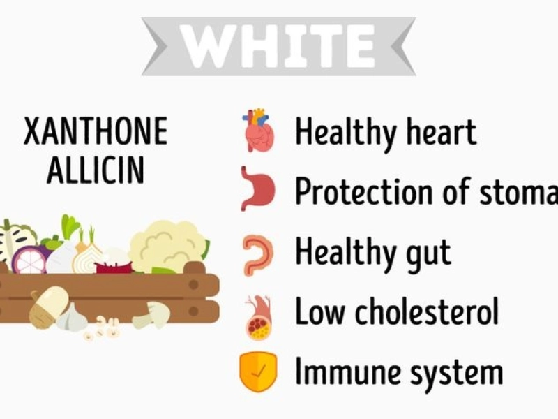 Xanthone, an antioxidant, anti-inflammatory, and anti-thrombotic compound, is present in white foods. It strengthens the immune system and guards against heart disease.For instance, onions are excellent sources of probiotics. Allicin, a compound found in garlic, lowers blood sugar and fends off heart attacks. Garlic and onions have bacterial and anti-inflammatory effects. As a natural diuretic, daikon radish aids in kidney cleansing and detoxification.