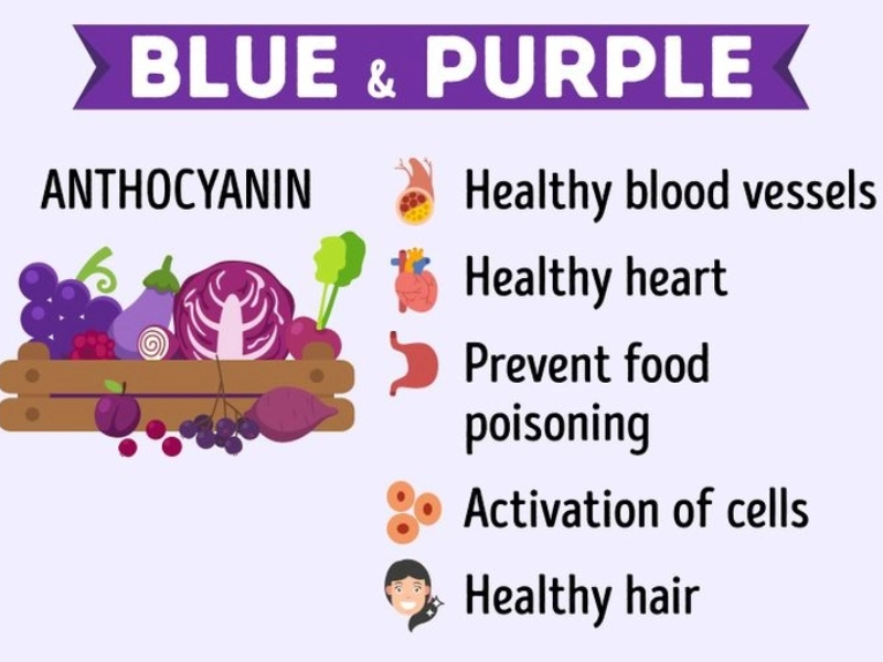 Foods that are blue or purple are wonderful for the urinary system and reduce the risk of cancer. These foods include anthocyanin, which prevents cell damage, promotes heart health, lowers cholesterol, battles obesity, and sharpens the mind.