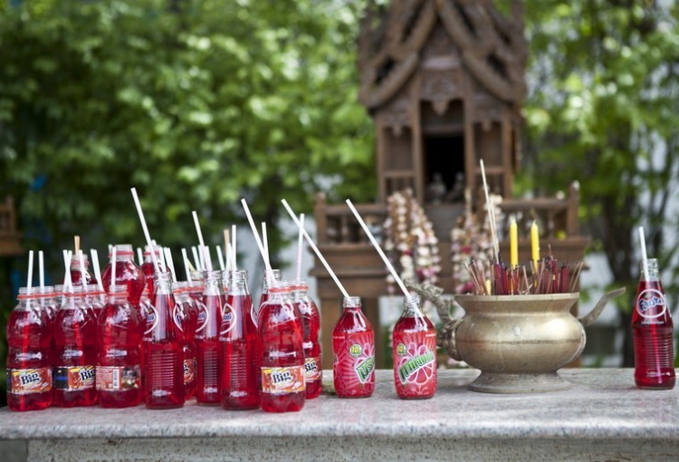 There are small altars everywhere where you can see bottles of red soda. It symbolizes the blood with which the Thais are trying to pay off evil spirits.