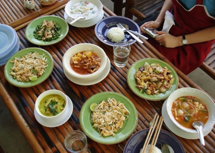 Food in Thailand is served with two or three utensils: a spoon, a fork, and chopsticks.