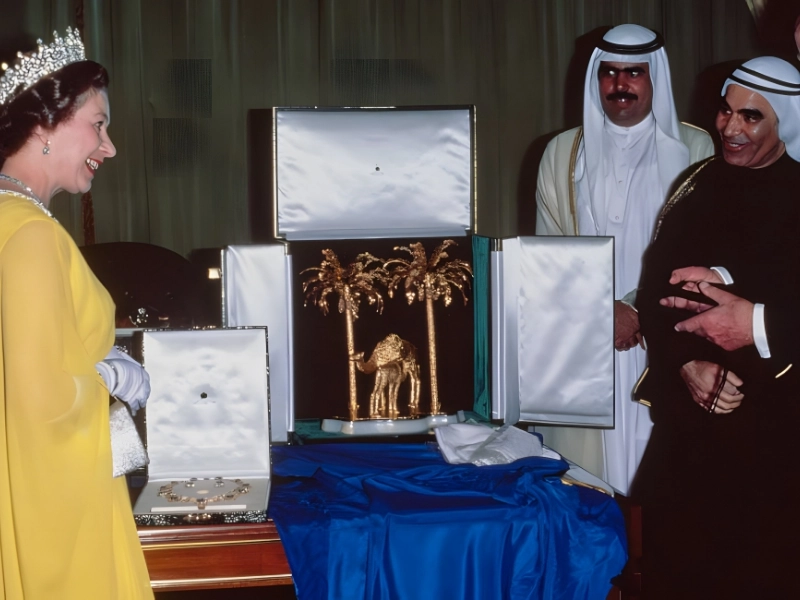 When Queen Elizabeth II travelled to the United Arab Emirates in February 1979, Sheikh Rashid, the ruler of Dubai, gave her a golden camel. Although the sculpture’s exact value is unknown, it is known that all of its parts are made of solid gold.