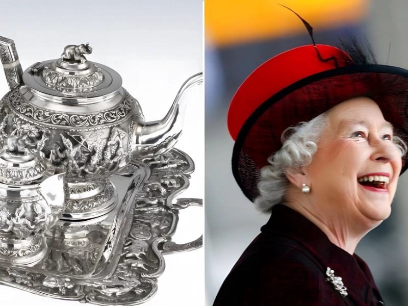 The Burmese silver tea set, according to the Royal Collection Trust, includes a sugar basin, a milk jug, and a teapot that are all arranged on a tray. With scenes of Burmese life, animals, and vegetation, every piece in this set is “embossed and chased.”