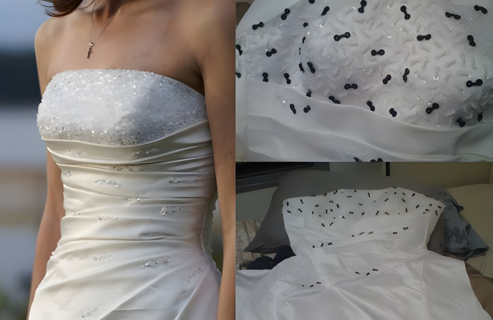 Every bride has their own particular look that they want to go for on their big day, but did this customer order her gown with a side of bugs? Unlikely. The black beading added looks nothing like the original dress ordered. Was there a mix-up at the factory?