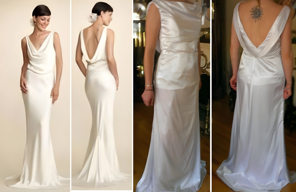 We don’t know who designed the original, but it looks great. The knock off, on the other hand, looks like it’s missing a yard of fabric and would be more fitting at the hen party than the main event. If we know anything, it’s that some websites just can’t be trusted!