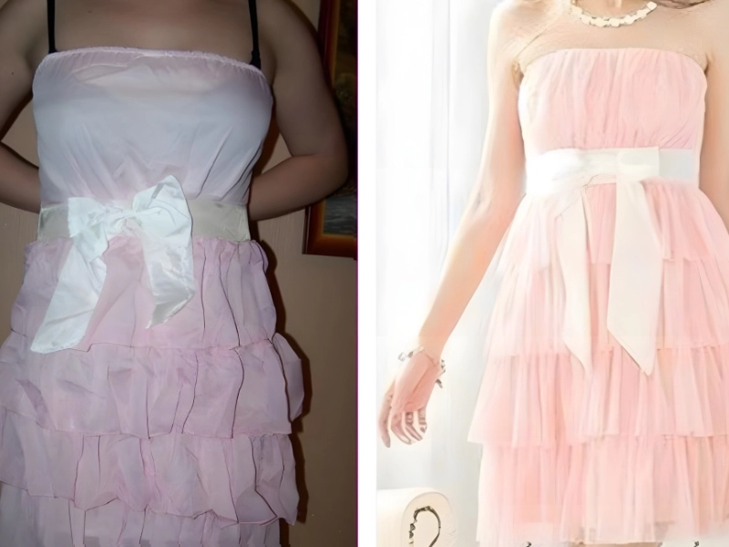 The material is so thin that the bust is totally see-through, in addition to the layering being completely off. Nobody wants to enter a party looking like an ill-wrapped gift. Hopefully, they managed to return it and saved the receipt.