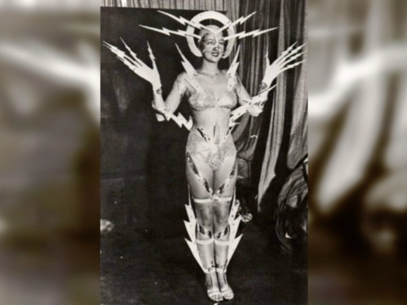 Elmera Hamphris took home the title of “Miss Radio” in 1939. Her spectacular outfit was adorned with lightning bolts constructed from regular cardboard.