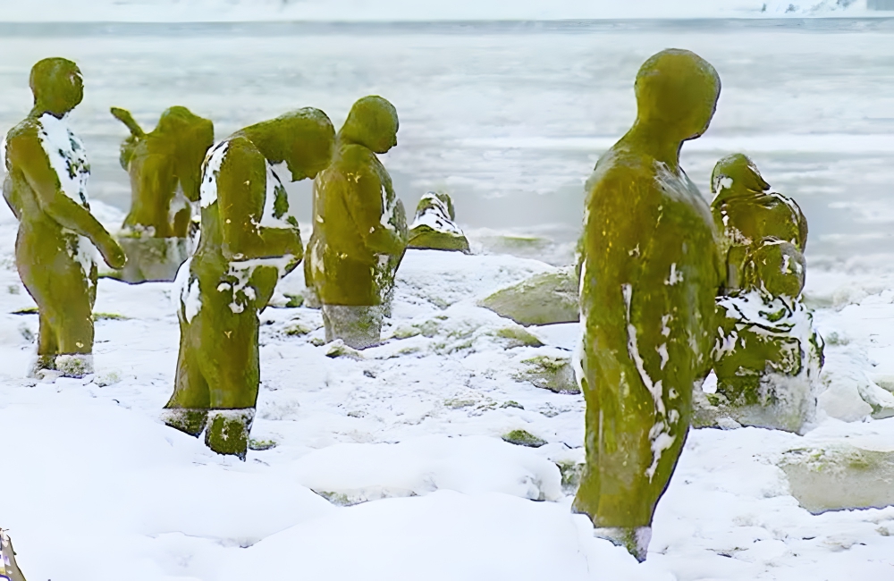 A few years ago, some Alaskans were startled to find a group of haunting figures lingering in the ice and snow on the bleak shoreline of Point Woronzof, near Anchorage. From a distance, they looked like real people in trouble. However, it turned out that the eerie shapes were actually an art installation by Sarah Davies.
