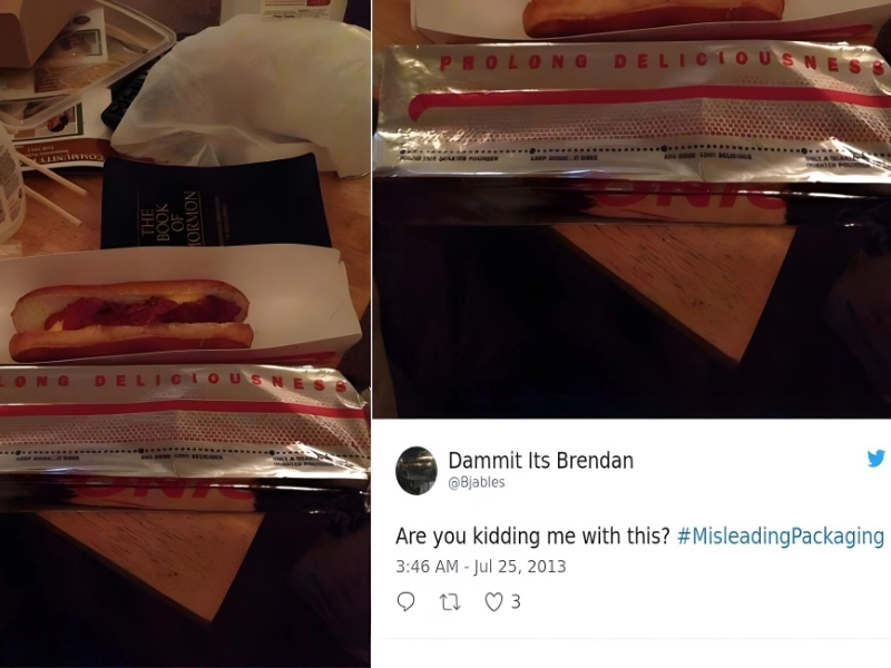 Twitter user @Bjables’ comment, “Are you kidding me with this?” aptly encapsulated everyone’s response. The packaging is intended to give the impression that the customer is receiving a gigantic hot dog, but in actuality, they won’t get to experience “Prolong Deliciousness.”