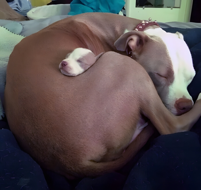 This pitty’s puppy wanted nothing more than to tuck itself into his mom’s body, and it seems as though mom wants to do everything to protect its pup at all costs too. It’s just too cute.