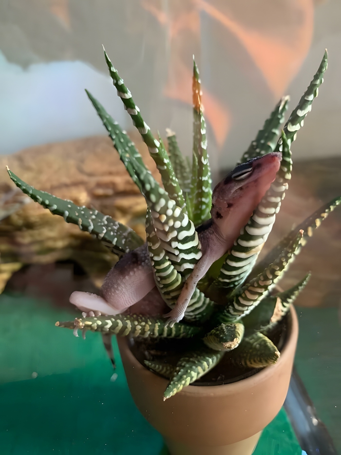 Everyone has their own perfect napping spot. For you, it might be on the couch in front of a roaring fire. For others, it might be in their school’s library. But for this guy, it seems as though they’ve found their perfect napping spot in their very own succulent. Yes, this leopard gecko seems to be pretty comfortable amongst the leaves of the succulent, and the smile on its face says it all.