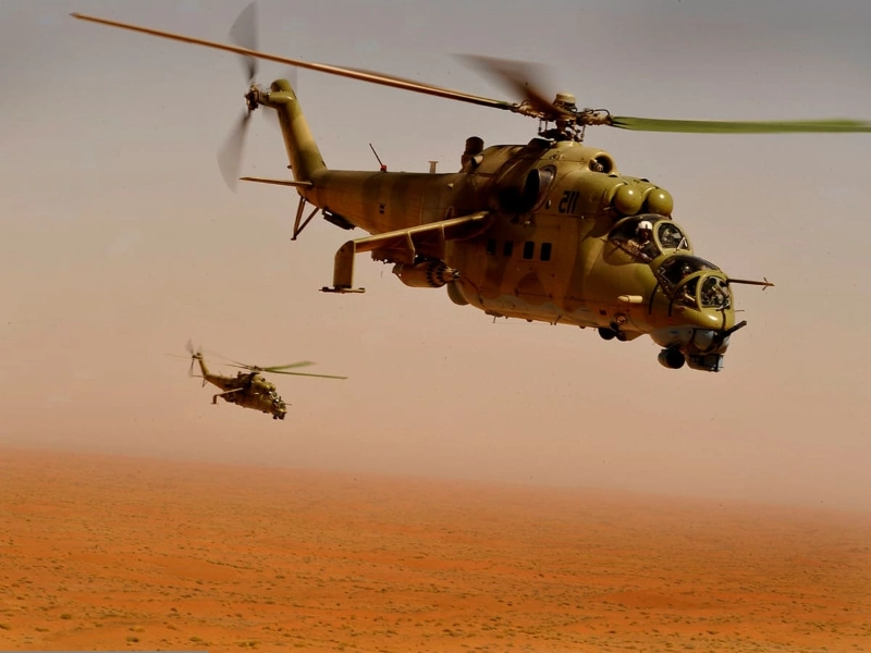 Combining gunship capabilities with troop transportation capability, the Mil Mi-24—named “Flying Tank”—by its crews transformed the idea of attack helicopters. This unusual dual-role design has armoured cockpit competent of withstanding strong small arms fire and characteristic stub wings for armament attachment. Although the Mi-24 can carry up to eight personnel, its remarkable arsenal consists in rocket pods, anti-tank guided missiles, and a flexible gun mount. With over 40 nations using several versions of this powerful machine, its strong build and proven combat effectiveness have led to general acceptance.