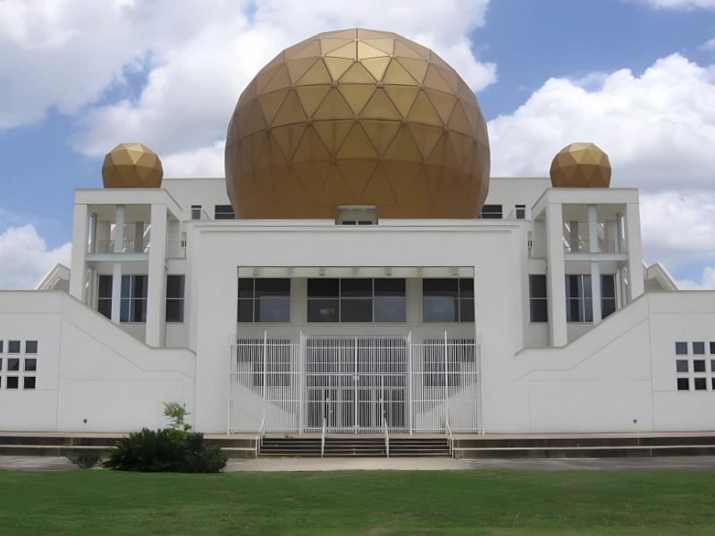 Located on Overture Drive in Houston, Texas, Chong Hua Sheng Mu Holy Place, often referred to as the Palace of the Golden Orbs, is a Taoist building. It stands out from the other suburban areas in the West because of the enormous golden ball that protrudes from its roof. The Palace protrudes over adjacent two-story apartment buildings and strip malls, making it easy to locate.