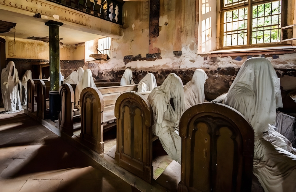 But, oddly enough, it was ghosts who brought St. George’s back to life. An artist installed thirty-two, white-sheet-covered ghostly figures in the church, seating them in pews, standing them by doorways, and putting them in the aisles. These ghost statues are a physical manifestation of the haunting of St. George’s.