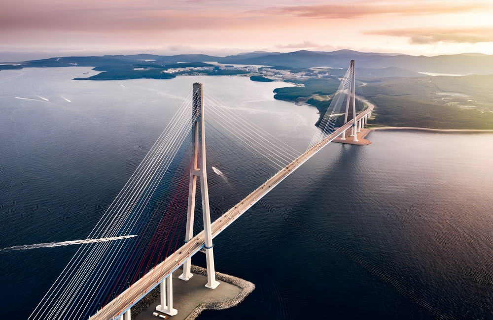 The design of the Russky Bridge was based on two main factors. The first was creating the shortest coast-to-coast distance over the channel (which has a navigable depth of 160 feet). The second was the ability of the Bridge to withstand extreme temperatures, waves of up to 20 feet in height, and ice formations that can reach 28 inches thick.