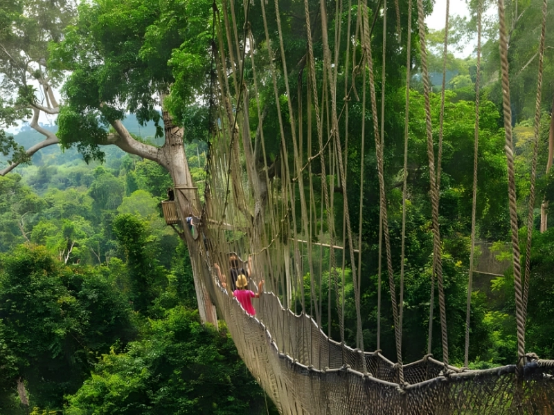 With a length of 1,150 feet, the Canopy Walk links seven treetops and gives interested visitors access to the forest. If you were walking on the ground, you wouldn’t be able to see the plants and animals that you can see now. At 130 feet high, the walkway is more like a collection of hanging bridges than a single hanging bridge.