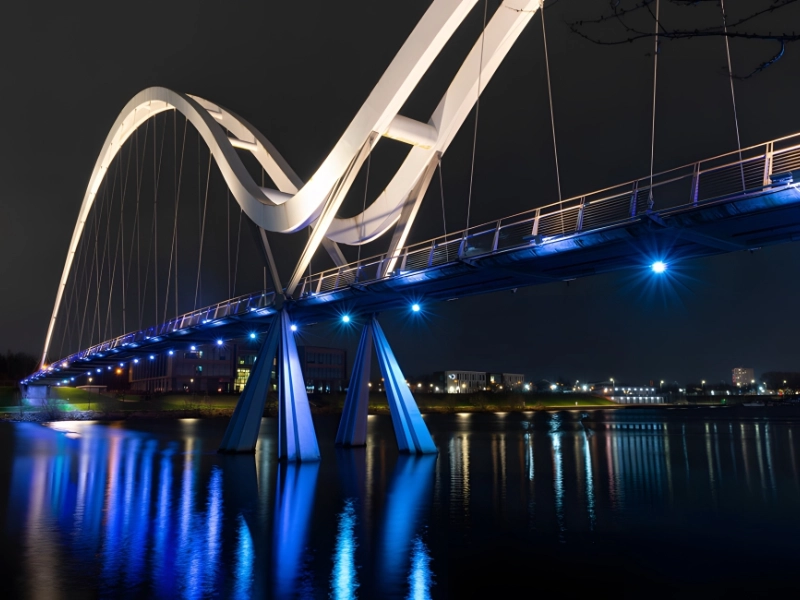 After spending $20 million, the Infinity Bridge was made accessible to the public in 2008. This bridge is accessible to the public for bicyclists and pedestrians in Stockton-on-Tees, England. The bridge is a dual-tied arch bridge, sometimes referred to as a bowstring bridge. One asymmetric pier is connected by a continuous set of steel arches of varying sizes.