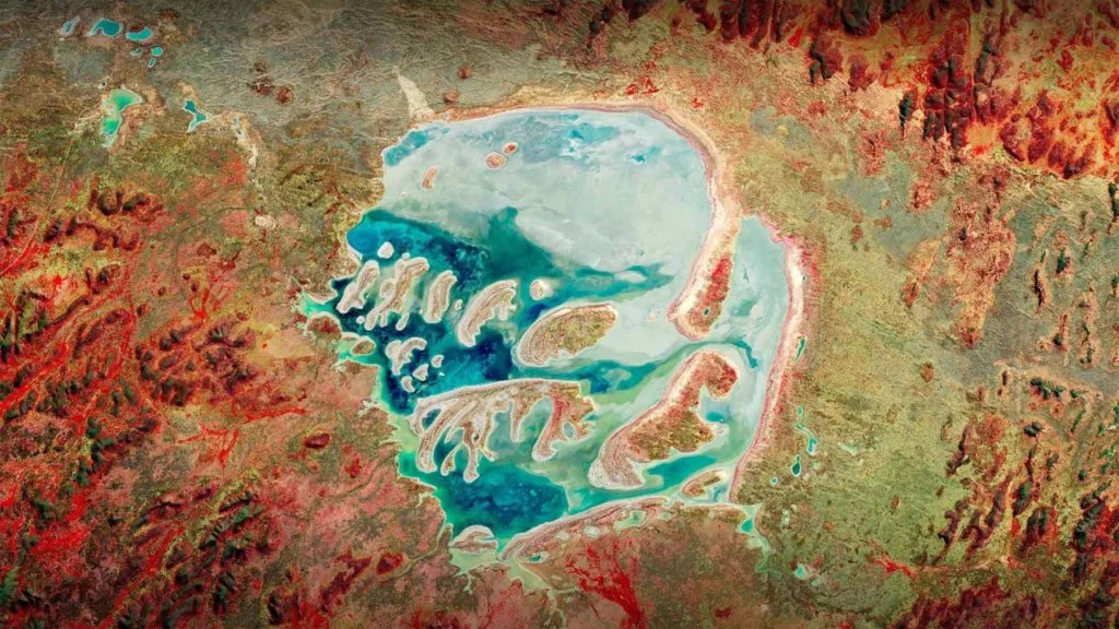 The Acraman impact structure is believed to have originally measured about 90 kilometers (56 miles) in diameter, although erosion over hundreds of millions of years has significantly altered its appearance. Today, the most visible remnant of the crater is Lake Acraman, a salt lake that occupies part of the eroded central uplift of the original crater structure.