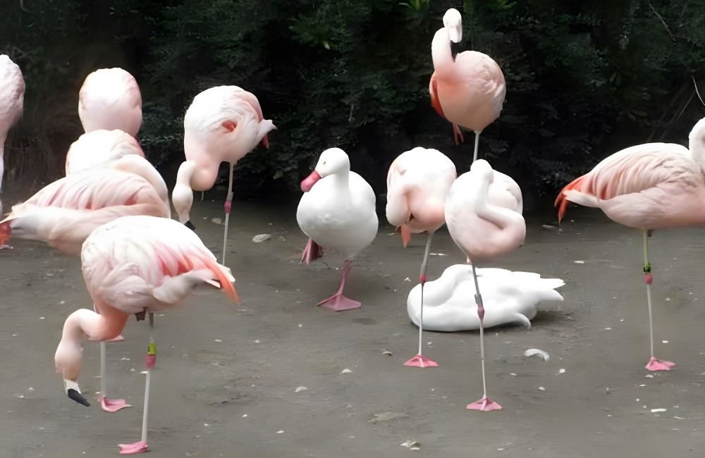 At least he was trying. His friend, another goose, tucked his head and fell asleep, not keen on pretending to be a flamingo. The goose standing on one leg is part of the gang, and he seems proud of it.
