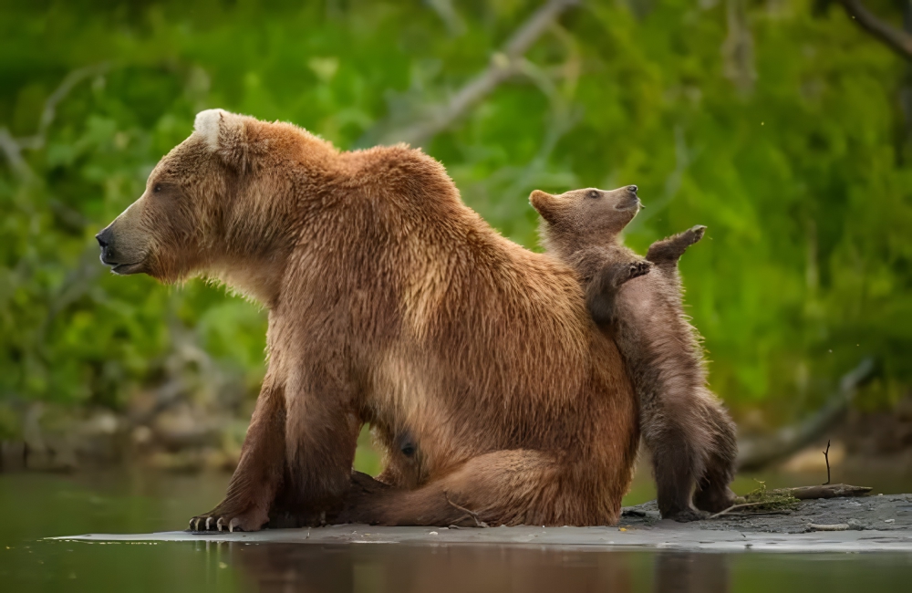 This photograph was titled “Leaning Post” by photographer Andy Parkinson, and it features a mother and son together. This little bear cub is using his mother to lean on, giving him a perfect platform from which to watch the birds in the trees.