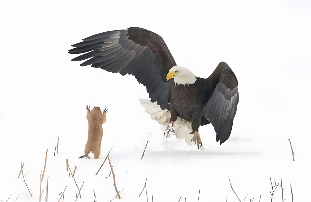 He missed his first attempt to grab the critter, and the prairie dog got the upper hand, lunging at him to startle his would-be predator. The eagle was surprised enough that it jumped back, wings flaring, and the bold prairie dog took that opportunity to dart into a nearby burrow.