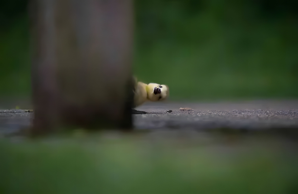Charlie Page was taking photos of a group of goslings when one little baby broke away from his pack, no doubt to do some exploring. The gosling was interested in what Page was doing, though he hid from him behind the leg of a bench.