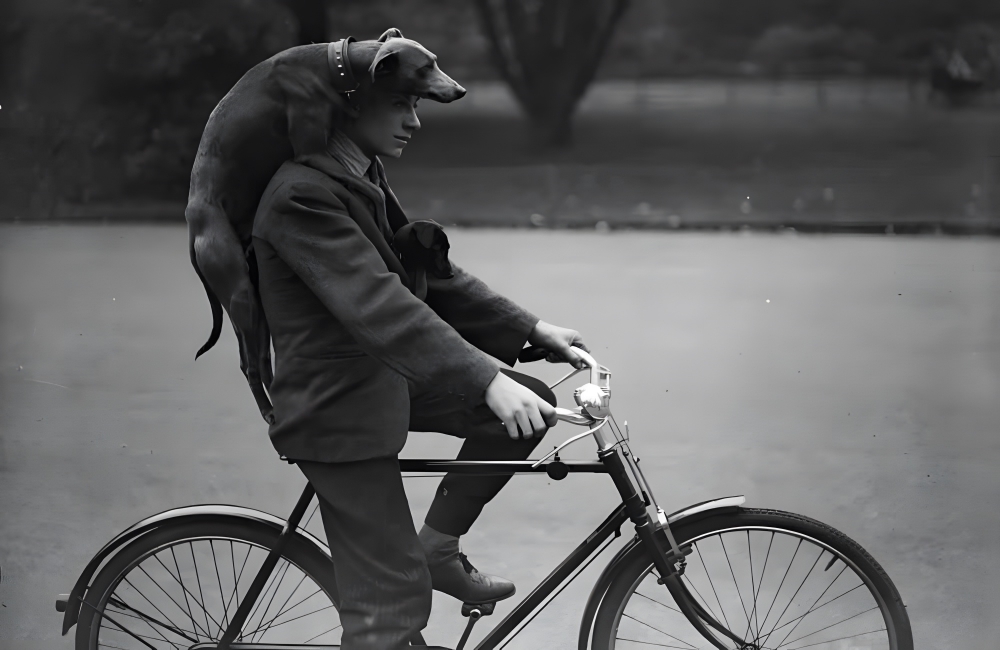 Dog standing behind bicycle ©Fox Photos/Getty Images