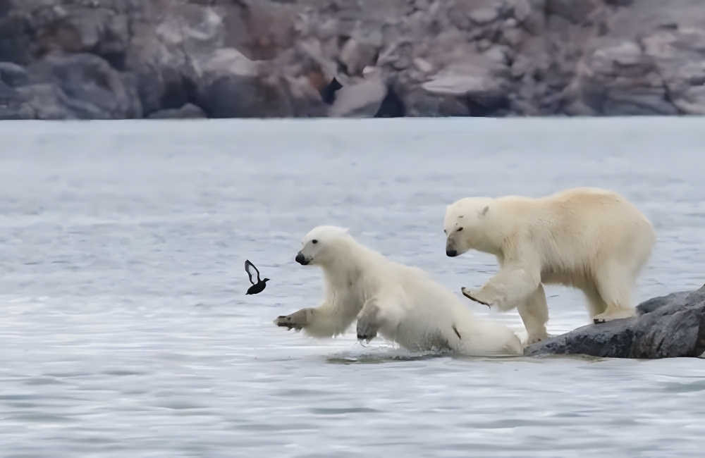 Brigitte Alcalay Marcon snapped the very essence of “curiosity” with her camera in the frosty Arctic backdrop. Here, two polar bears—Nature’s frosty giants—seem captivated, not by a seal or a fish, but by a fluttering butterfly. The younger bear looks like it’s about to break into a dance, with its paw raised high, trying to match the butterfly’s waltz.