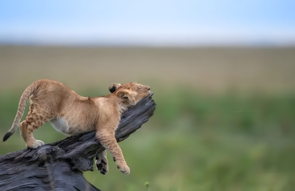 Christian Hargasser has brought the Serengeti’s whimsical side to the limelight. Amidst the endless stretches of the African savannah, where the game of predator and prey is an everyday tale, a young lion cub decided to take a well-deserved siesta. Instead of hunting or playing with its siblings, this little monarch of the future found an unlikely throne – an old, gnarled log.