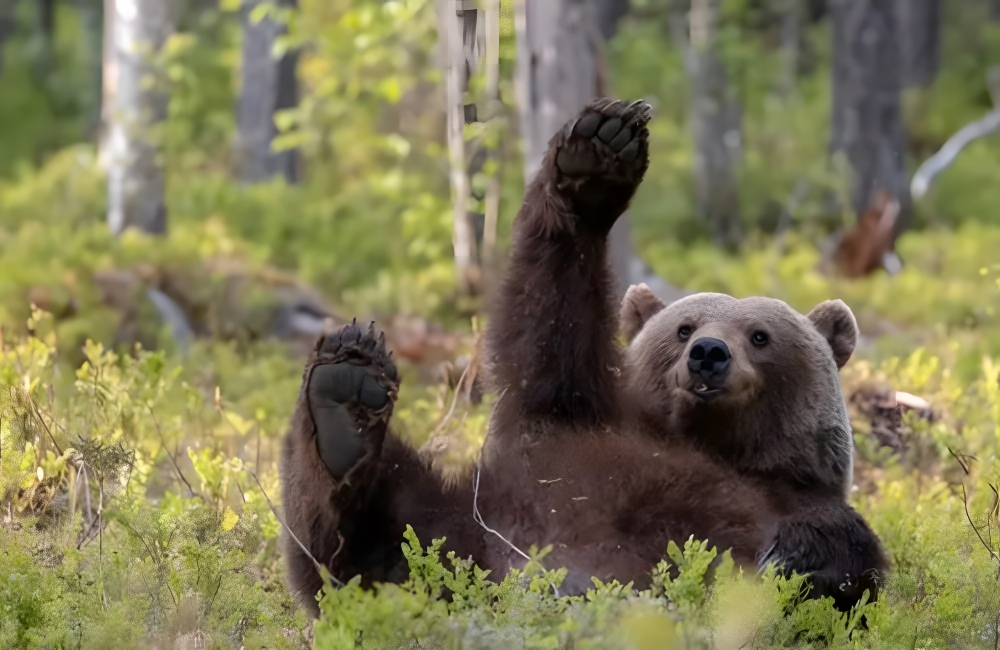 Amid the serene Finnish forest, Dikla Gabriely captures a whimsical moment where a brown bear reclines with unabashed playfulness. Its paws raised high, the bear seems to beckon the viewer for attention, overshadowing other bears with its endearing antics.