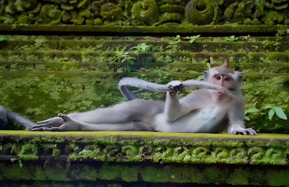 In the lush green temples of Bali, a playful drama unfolds. Delphine Casimir, with a lens sharper than most eyes, captures the essence of what it means to be cheeky. A macaque, sprawled luxuriously on moss-covered steps, takes center stage. His eyes are lit with mischief, and his tail – perhaps the most entertaining appendage of all – is grabbed in a moment of whimsical self-reflection, or maybe just for a quick grooming session.