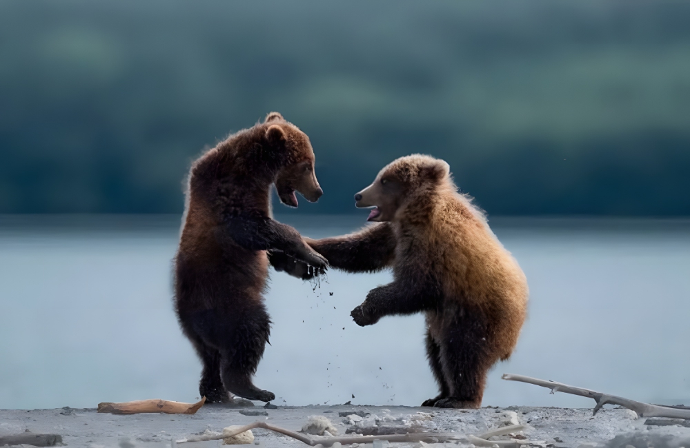 Nature has its way of making everyday moments extraordinary. This photo features two fuzzy bear cubs, taking advantage of a clear lakeside dance floor, have decided to engage in the age-old art of dance. Whether they’re practicing for “Dancing with the Stars: Wilderness Edition” or simply having a disagreement over who gets the last fish, one thing’s for sure: their dance moves are impeccable.